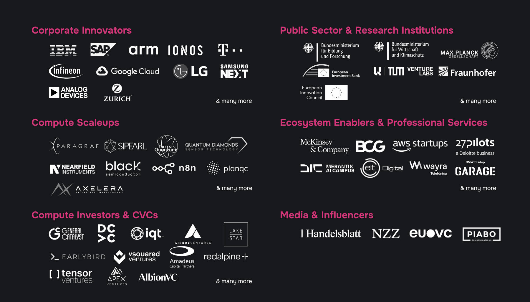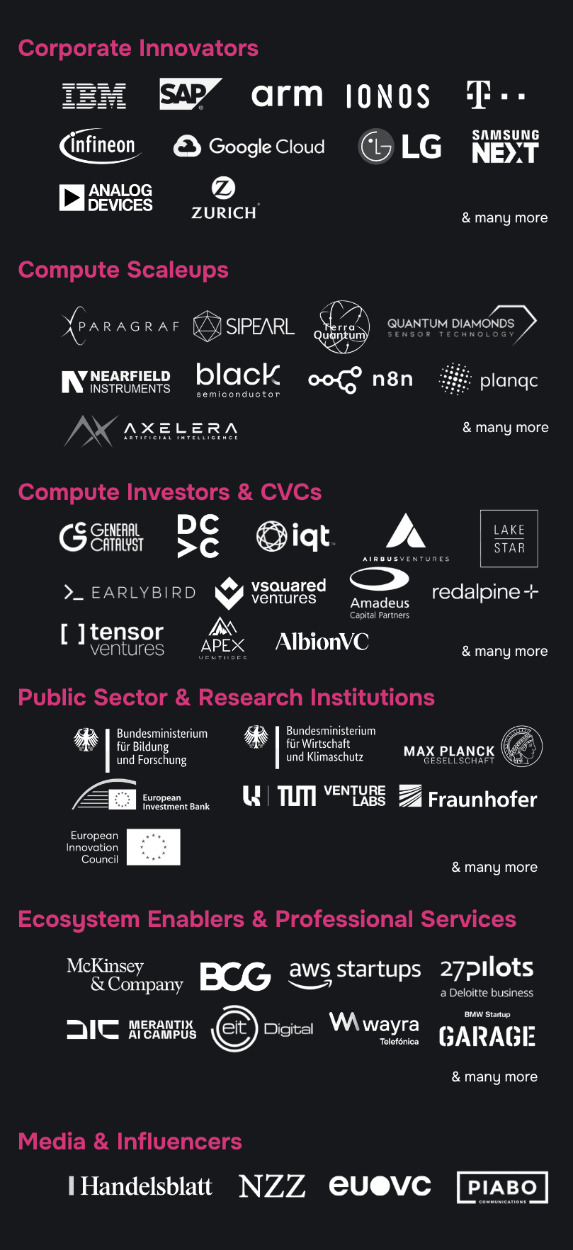 Enterprise HPC leaders across data centers, cloud, finance, telecom, automotive, aerospace and the public sector — alongside next-gen providers in AI infrastructure, photonics and quantum security, and investors from VCs to LPs.