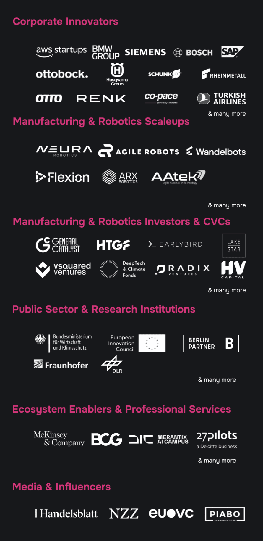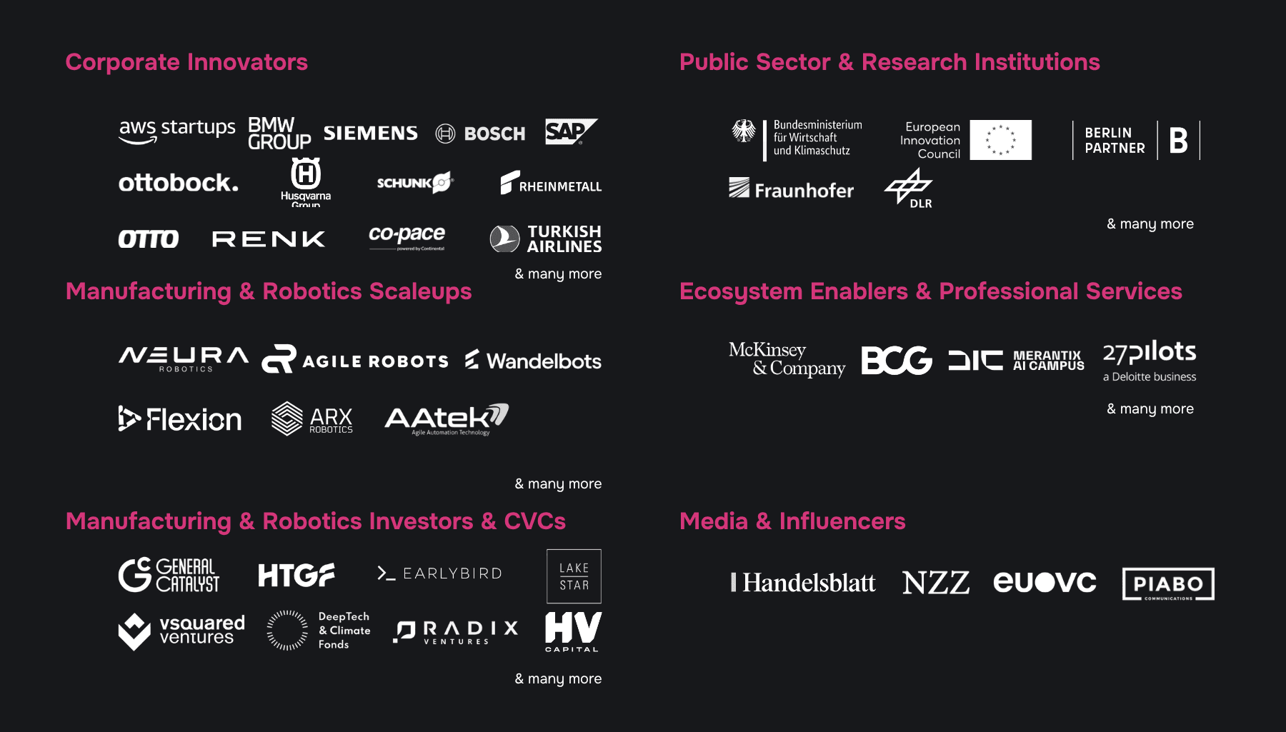 Enterprise robotics and manufacturing leaders across automotive, food & beverage, logistics, critical infrastructure and industrial sectors — alongside next-gen providers in industrial robotics, automation platforms, digital twins and embodied AI, and investors from VCs to LPs.